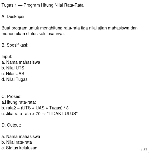 Mata kuliah ini membahas konsep dasar algoritma, logika pemrograman, dan implementasinya menggunakan bahasa pemrograman tertentu. Materi umumnya mencakup pengenalan algoritma, tipe data, variabel, operator, struktur kontrol (sekuensial, seleksi, perulangan), fungsi/prosedur, array, dan cara memecahkan masalah secara sistematis. Tujuannya adalah agar mahasiswa mampu berpikir logis dan merancang algoritma untuk menyelesaikan masalah, lalu mengimplementasikannya menjadi program komputer yang efisien.